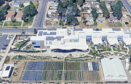 Google Earth view of Aquaponic Greenhouse (right), soil farm south of the greenhouse and community farmstand (left).